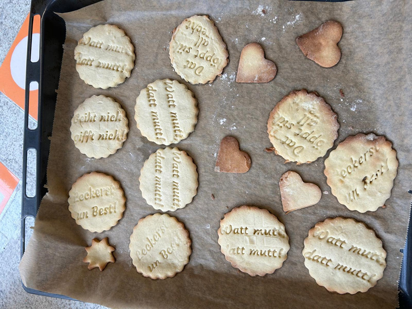 Für den Weihnachtsbasar hat die Plattdeutsch AG Kekse mit plattdeutschen Redensarten gebacken. Diese wurden dann auf dem Basar verkauft. Folgender Text war auf den Keksen zu lesen1