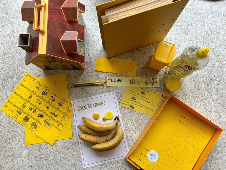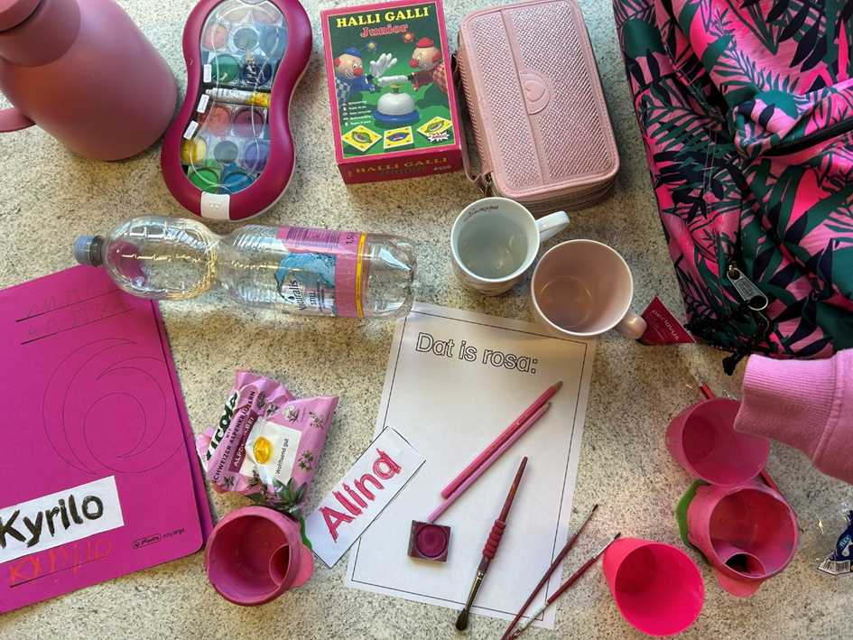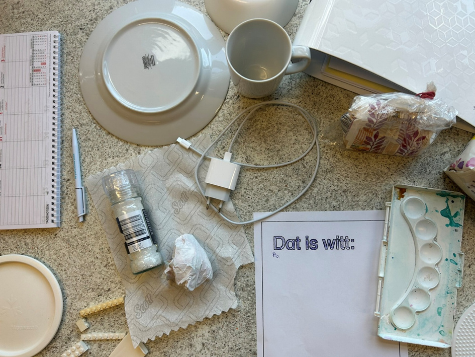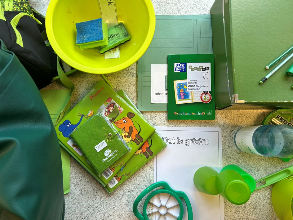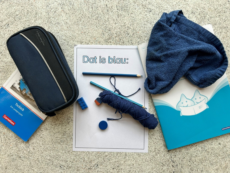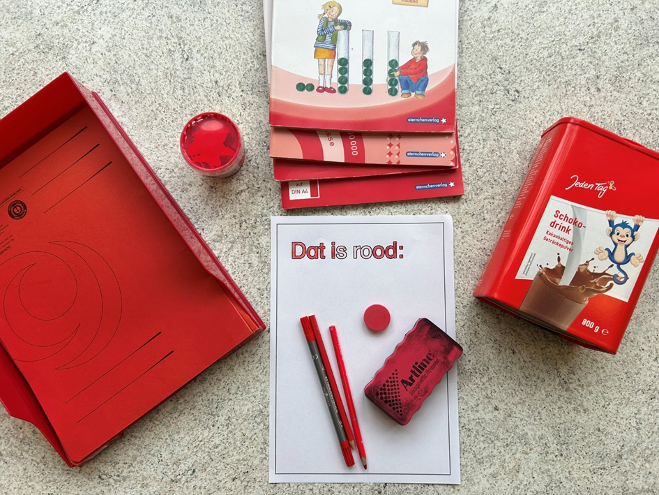 Vandaag hebbt de Kinner in de Plattdütsk AG wat to de Farven maakt. Se hebben toerst „Ik seeg wat, wat du nich süchst“ spölt und daarna Saken in d’ Klaas söcht, de en bestimmte Farv hebben. Hier kannst du sehn, wat se al funnen hebben: |