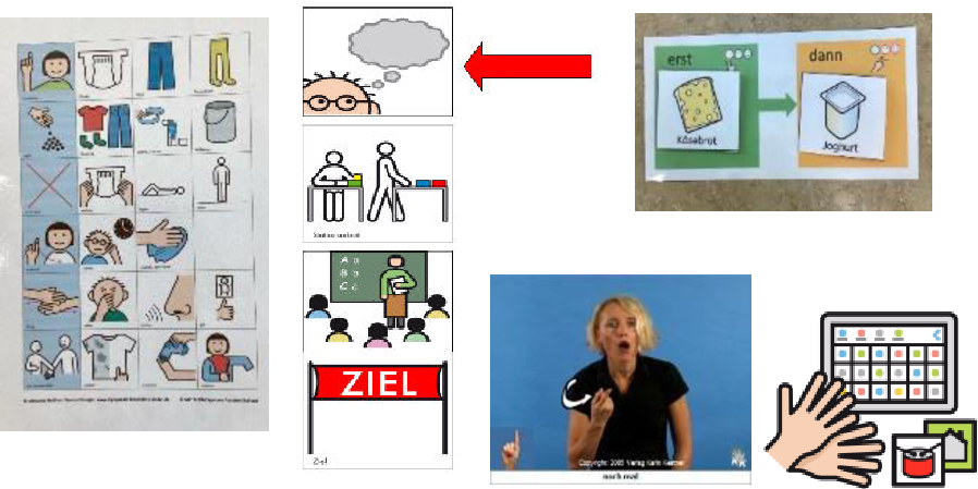 Pläne helfen den Kindern sich zu orientieren. Bildkarten und Gebärden helfen ebenfalls in der Kommunikation. So lernen die Kinder ihre Wünsche und Bedürfnisse mitzuteilen.