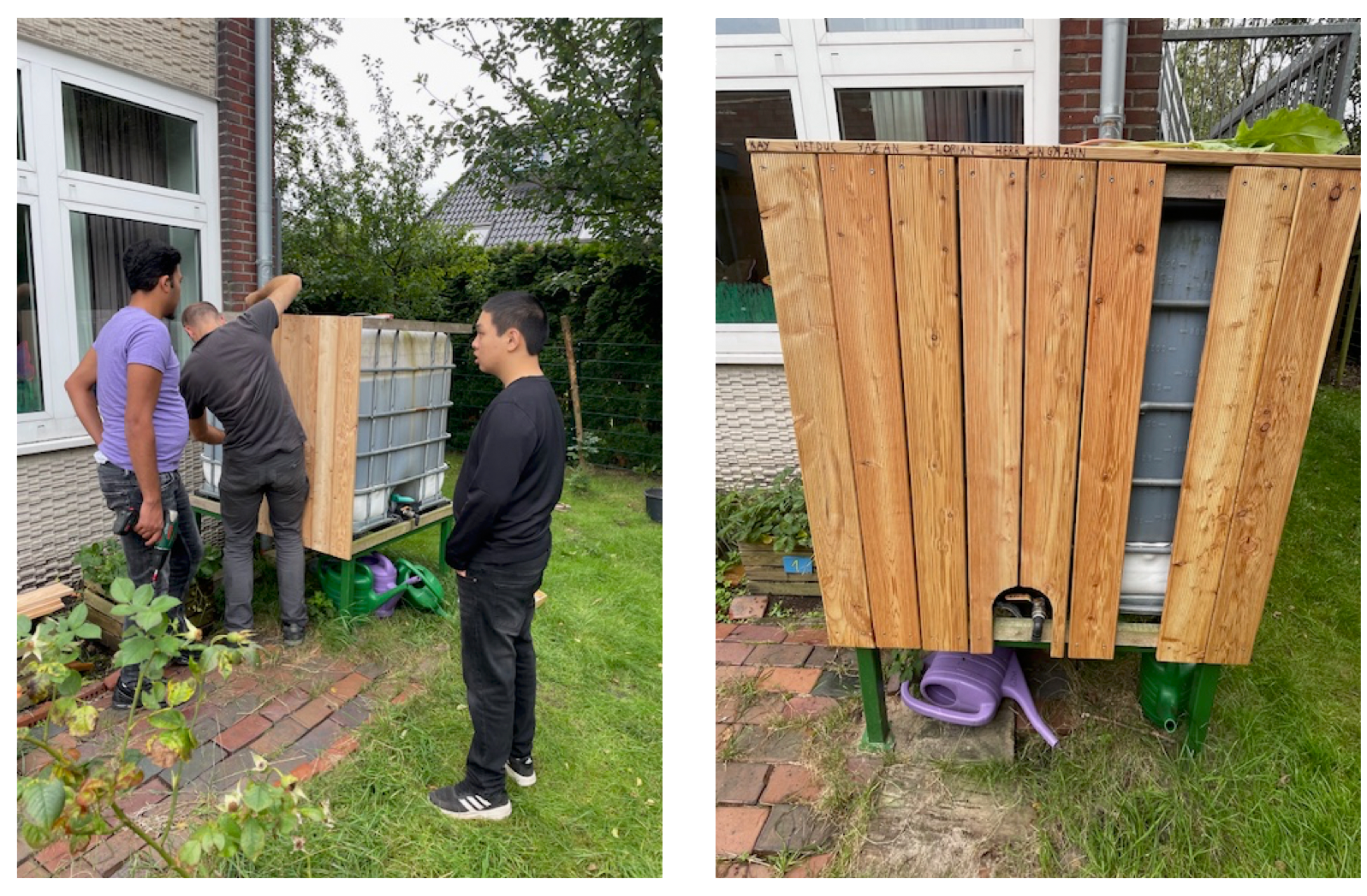 Im Garten haben wir einen großen Wassertank aufgestellt. Der Tank ist nicht neu gekauft. Andere Menschen haben ihn vorher schon einmal für etwas benutzt. Unsere Schule hat den Tank also gebraucht bekommen. Dann haben wir Holzleisten angeschraubt, damit er schöner aussieht und geschützt ist. Wir benutzen das wasser, um die Pflanzen zu gießen